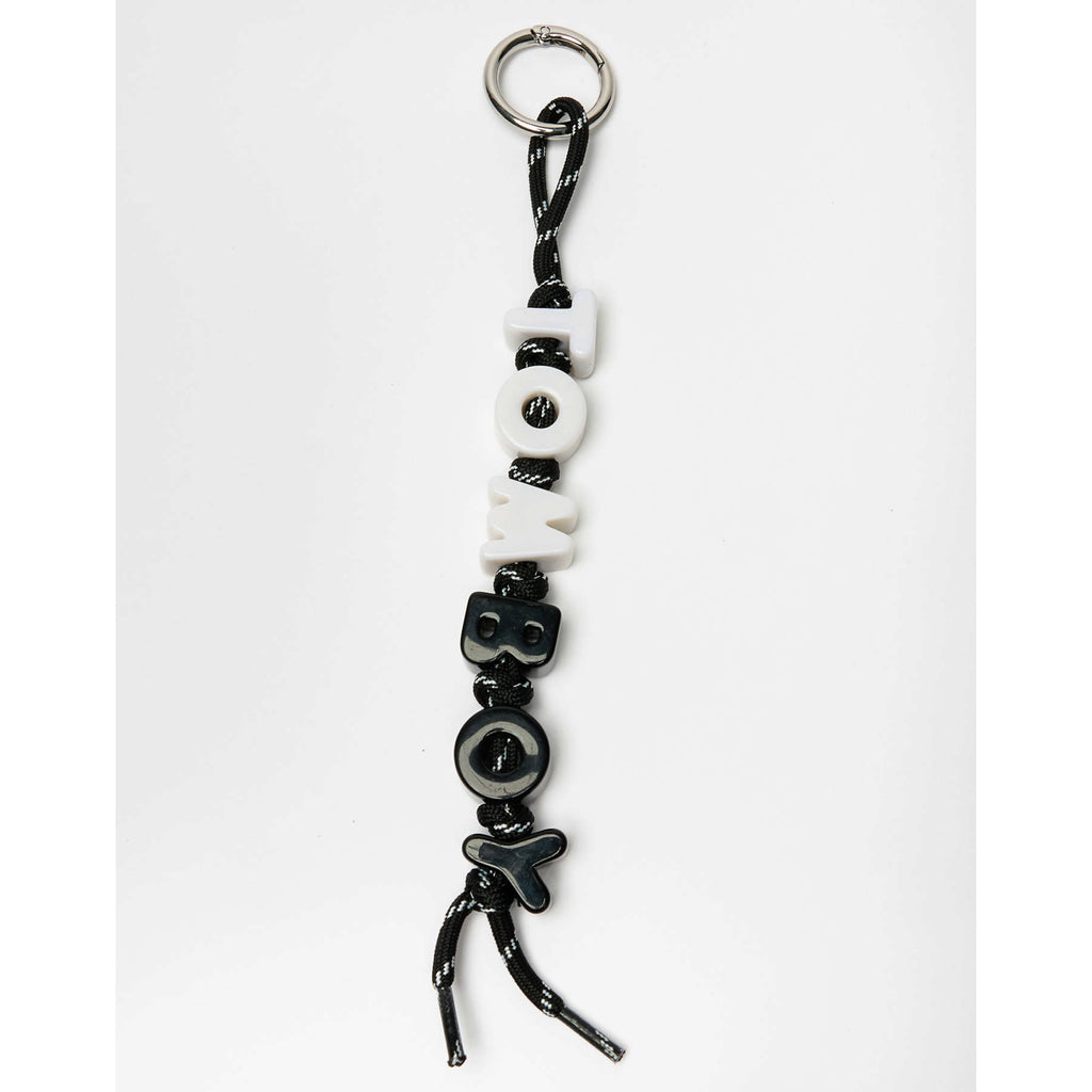 - CE PORTE-CLÉS TOMBOY AVEC LETTRES 3D BLANCHES ET ROUGES EST RÉALISÉ AVEC UNE CORDE D'ESCALADE ET UN MOUSQUETON ARGENTÉ.